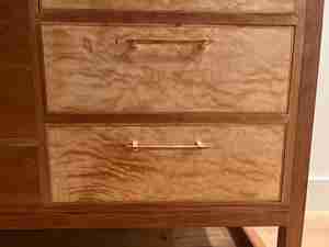 Some pieces of furniture ask to be noticed from across the room. This credenza earns that attention through contrast: a cherry casework frame whose warm, deepening tones set off the chatoyance of the quilted maple drawer fronts — a figure so active it seems to shift and ripple as you move past it. The two species don’t merely complement each other; they create a conversation that changes as the light moves through the day.