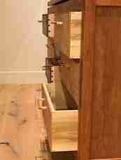 The floating top heightens that effect. Proud of the casework and separated by a deliberate shadow gap, it appears to levitate above the piece — an illusion sustained by a hidden spine with ribs mortised into the upper frame, so the magic of the effect is never explained by what you can see. Ten drawers, arranged in a classic three-column layout, are fitted with half-blind dovetails throughout: a joint that rewards the person who opens a drawer as much as the one who only looks.