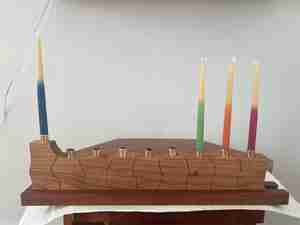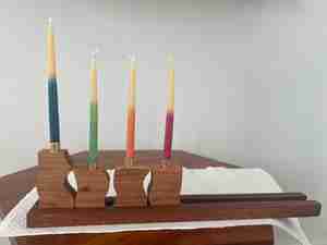 This Hanukkiah turns the ritual of the holiday into a nightly puzzle. Eight candleholders ride a sliding dovetail track, each one shaped with irregular edges that interlock with their neighbors in exactly one configuration. The family’s job — especially the children’s — is to find it.