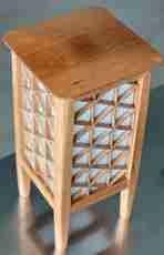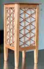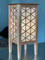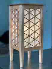 What sets this lantern apart is its kumiko lattice, worked in the mitsugumite pattern — an intricate three-way joint that produces a continuous field of interlocking triangles and diamonds across each panel. The construction is as compelling up close as it is from across the room. Tapered legs and a clean-lined cap give the piece a lighter, more open presence than a traditional box lantern.